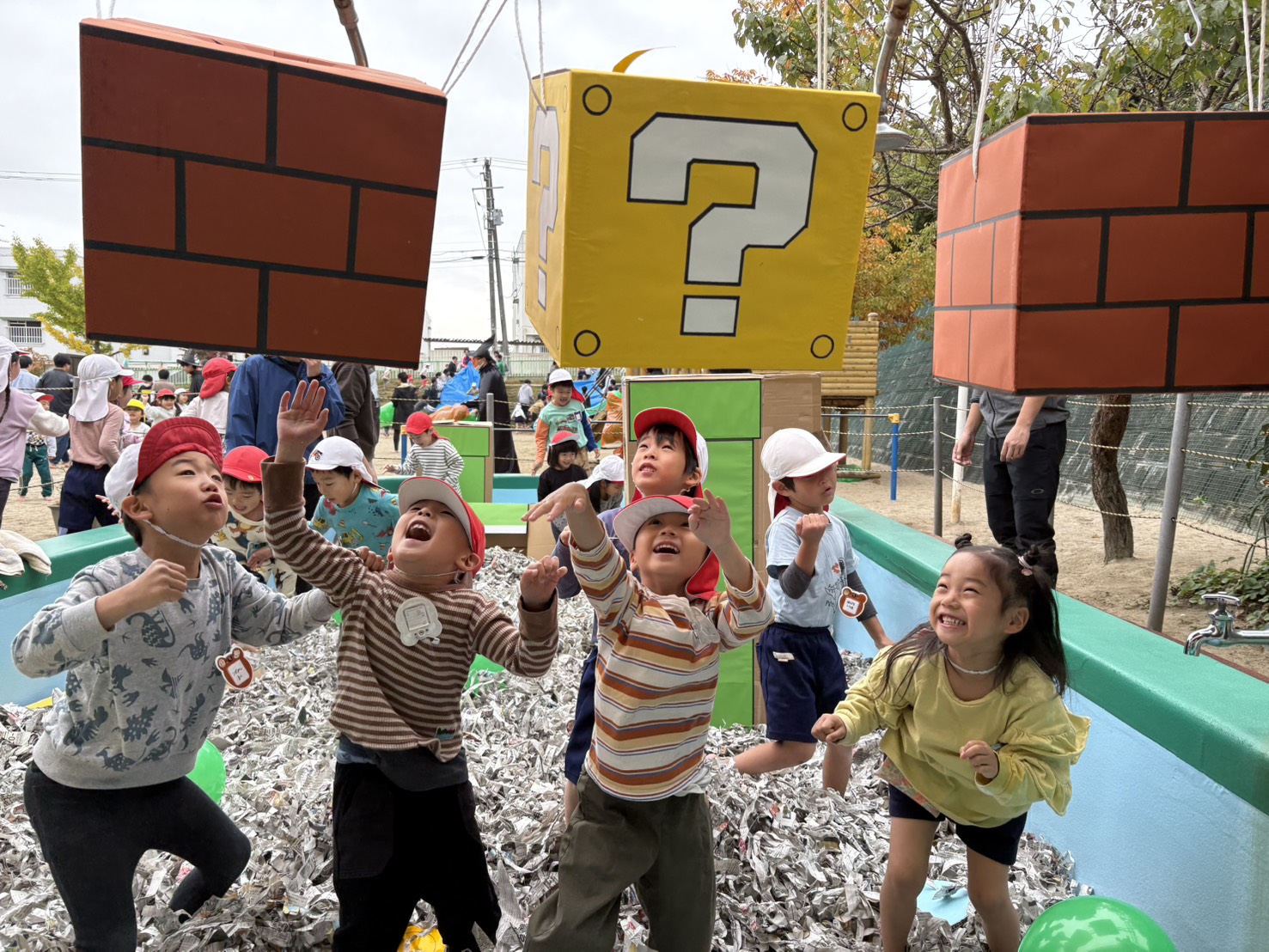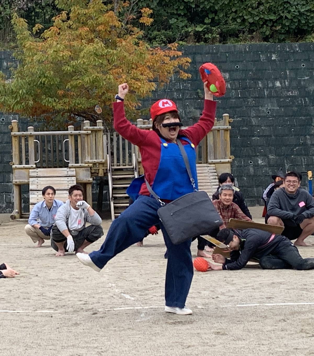 「スーパーおやじワールド」この名前を考えたのは、おやじの会企画会のお父さん達。秋のお父さんと遊ぶ会はいつもお父さん達が体を使って子ども達を楽しませてくれるのですが、今回、お父さん達の企画のテーマになったのは、あの有名なゲーム✨テーマを聞いただけでワクワクしてきますよね♪そんな”子ども達を楽しませたい!”という気持ちと遊び心いっぱいのお父さん達なのです(*^_^*)そんなおやじ達は、遊びの他にも何やら楽しいことを考え始めました。それはマリオ園長VSおやじクッパのオープニングセレモニー!!(?)そんな案に園長先生は「え~💦マリオについて何も知らない~💦」と後ろ向き。なのになのに、当日になってみるとじゃじゃーん!!こんなに立派なマリオに変身!そして、みなぎるやる気(笑)