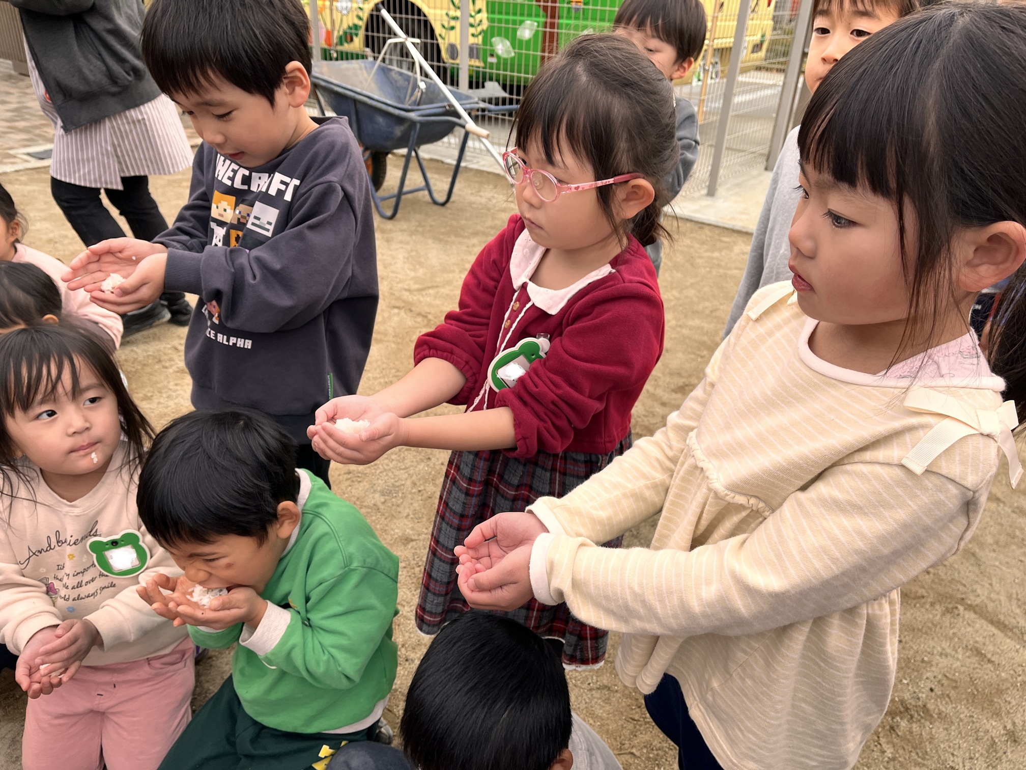 お米は自分たちで持ち寄り、羽釜で炊きました!炊き立てのお米はなんておいしいのでしょう✨おにぎりを握る前の味見で大興奮の子どもたち😁