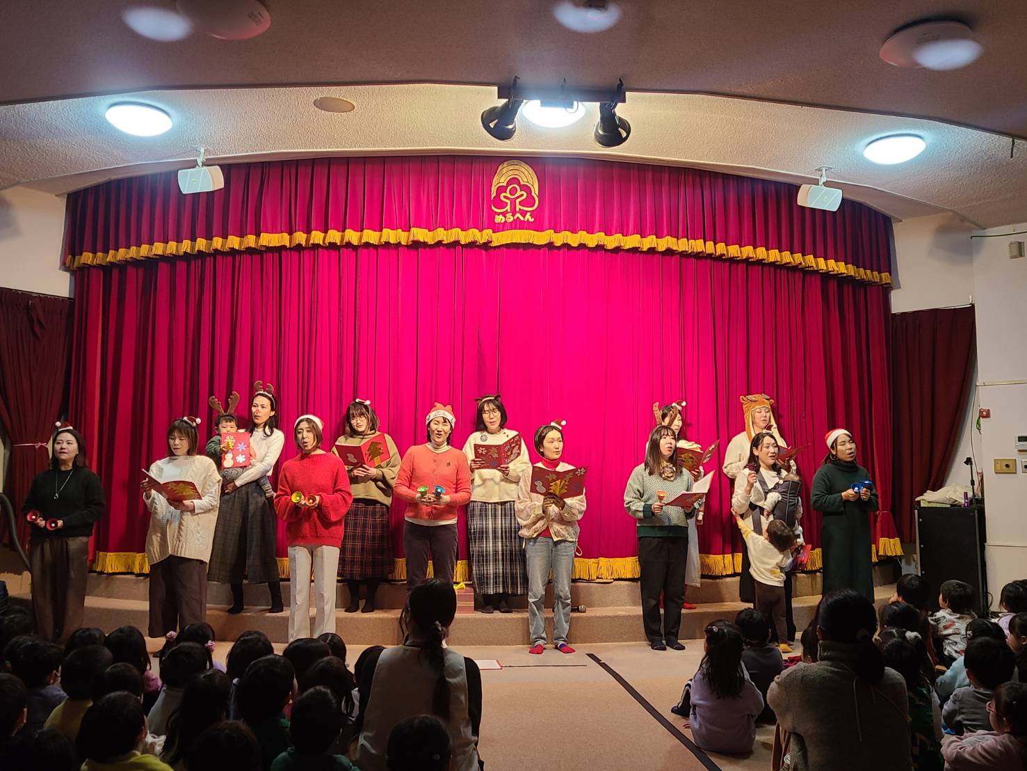 続いてはコールめるへんさん✨ハンドベルの”星に願いを”からスタート♪きれいなハンドベルの音色に子どもたちは釘付けです👀。たくさんのクリスマスソングを歌って頂きましたが、ジングルベルでは、年中さんが「これは合唱会で歌う曲だ!!」と張り切って一緒に歌う姿がありました🎄