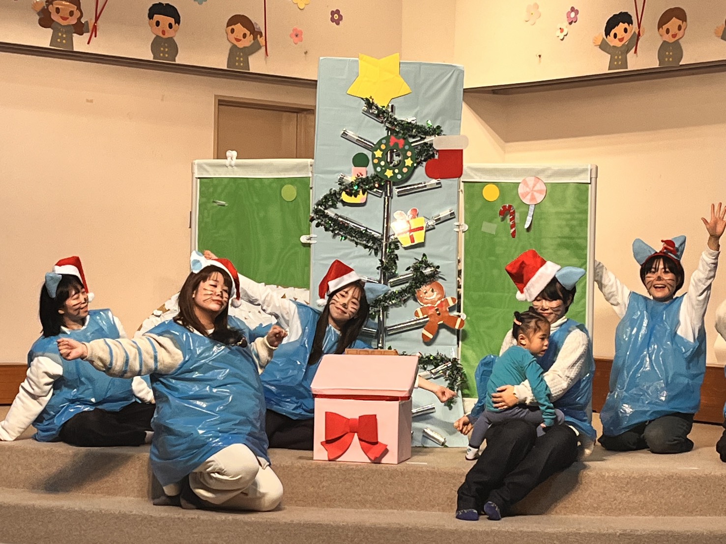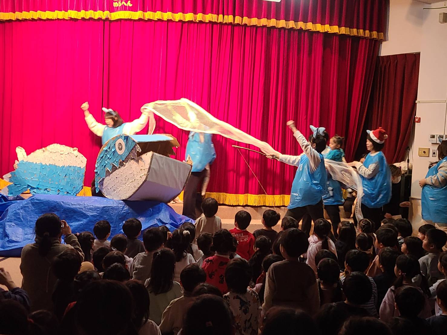 お次は絵本サークルさんによる”11匹のねこ”の劇✨いたずらねこ達が大きな魚を釣るために大騒ぎ💦見ている子ども達も「頑張れー!!」と、大盛り上がり♪無事に釣って食べ終えた後に出てきたのは・・・、なんと!魚の骨で作ったクリスマスツリーなのでした✨!!