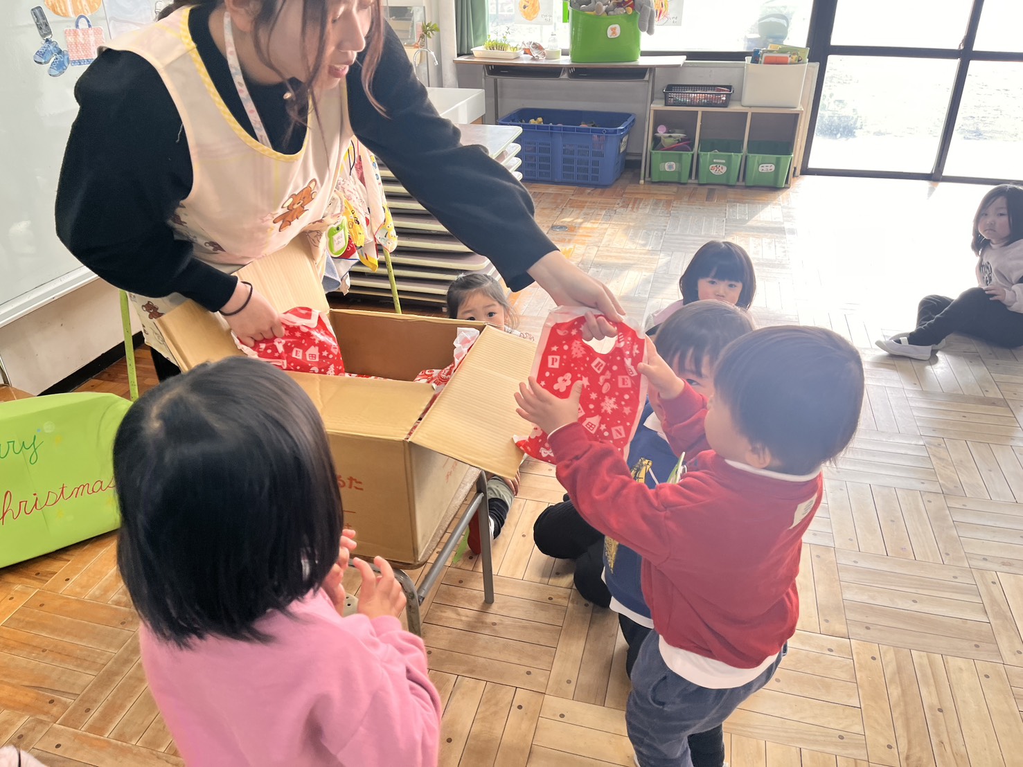 最後にみんなで「あわてんぼうのサンタクロース」を歌うと、シャンシャンシャン🔔と鈴の音♪めるへんにもちょっと気の早いサンタクロースが来てくれたようです🎅💖保育室に行ってみると、ちゃーんと、みんなへのプレゼントが届いていました☆