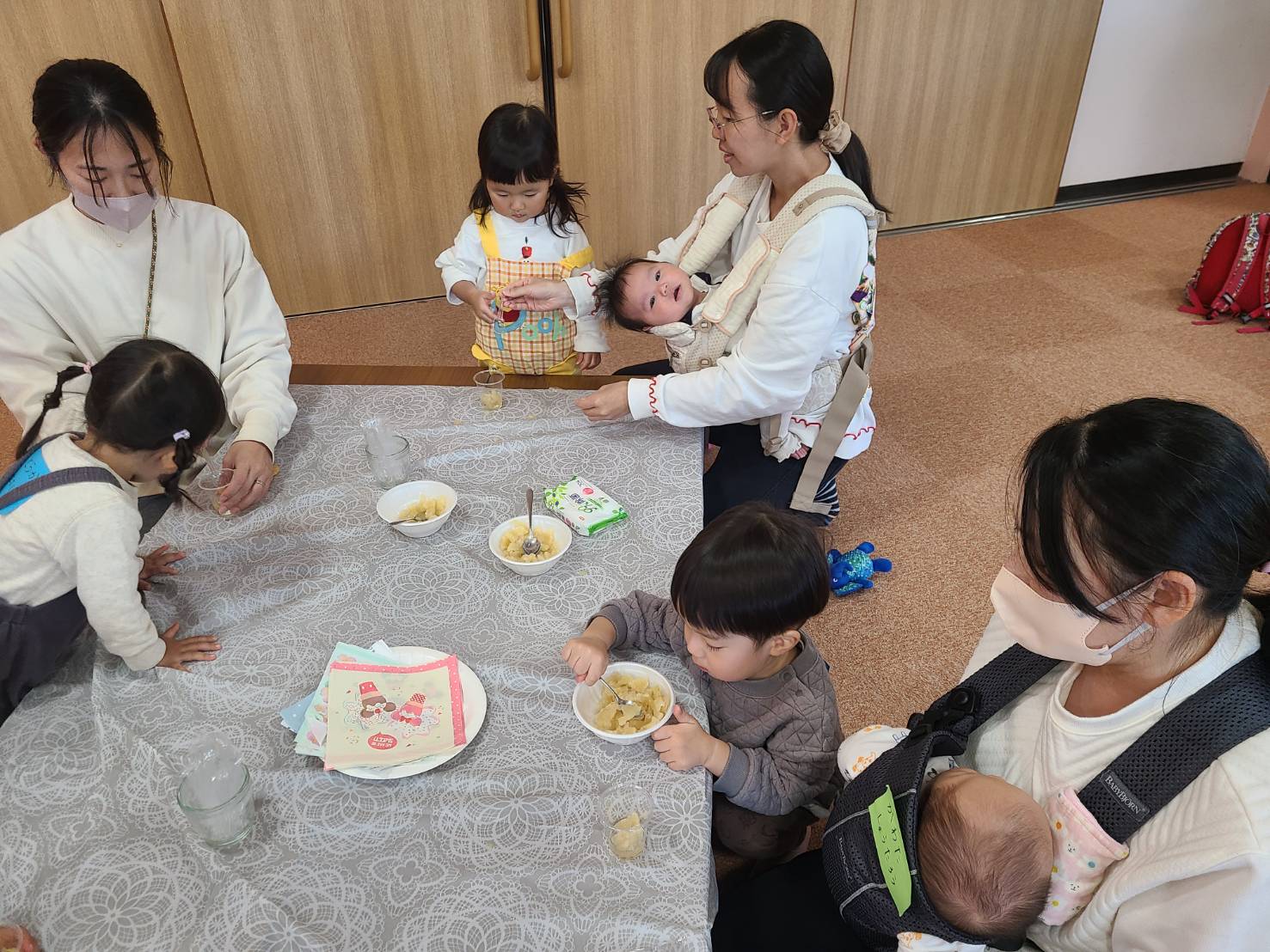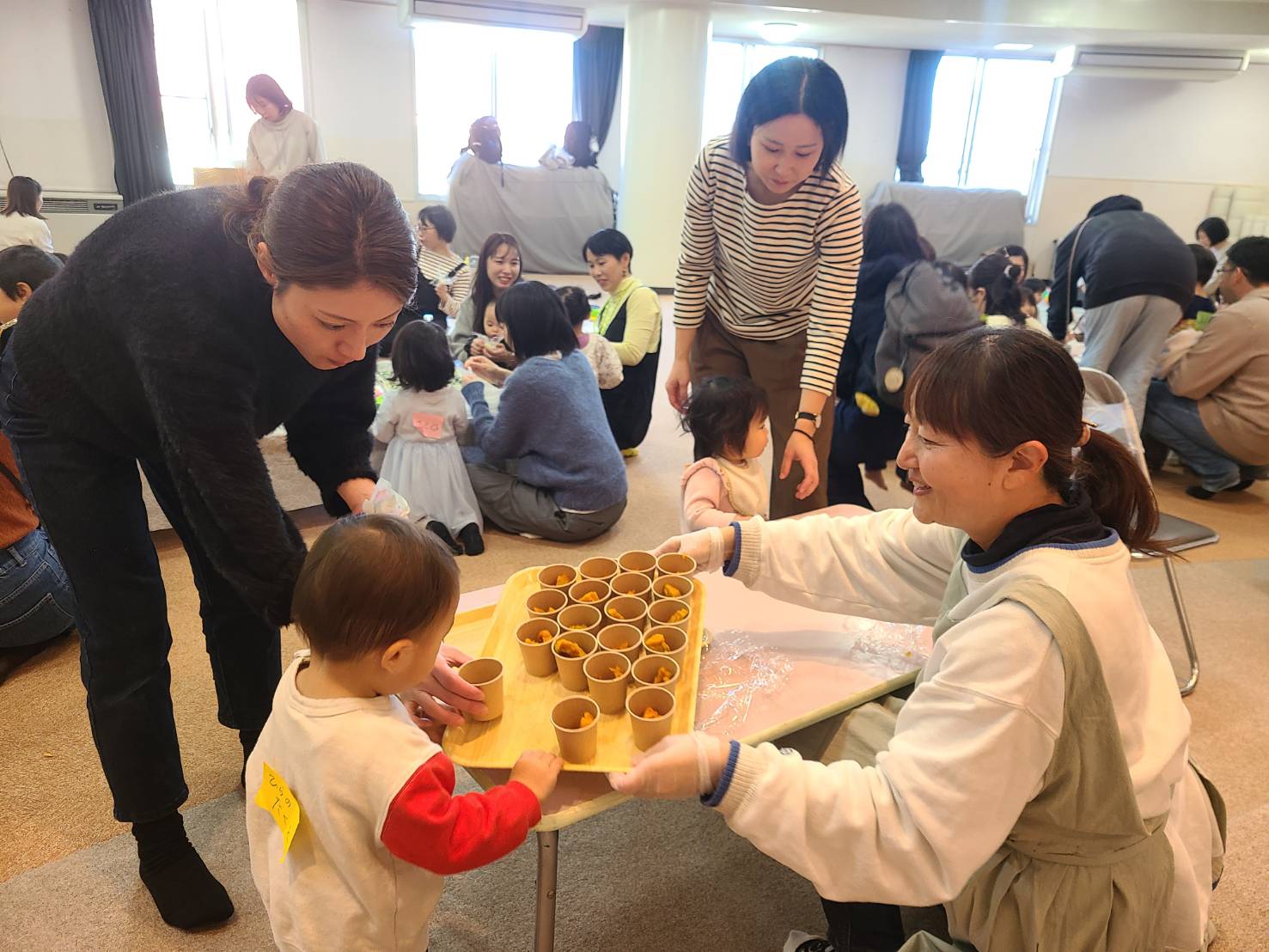 今回のメニューはさつまいもの茶巾✨、かぼちゃのペースト✨、すぐに固まるりんごゼリー✨の三種(*^_^*)朝からせっせと準備開始!いろんな職員が「今日はなんだか美味しそうな匂いがするな~♪」と職員室をのぞいていきます👀こんなにたくさんのさつまいもやかぼちゃ、多すぎたかな~!?とも思いましたが、いざクッキングが始まると次々におかわりに来る子が✨口いっぱいにかぼちゃを入れながらよちよち歩きでおかわりのかぼちゃに手を伸ばす子や、「もう終わりにしなさい💦」とおうちの方が止めに入るほど食べ続ける子も(笑)子ども達だけでなく「おうちの方もどうぞ💖」とすすめると、ほぼ完売✨※ぜ~んぶ無料です(*^_^*) 子ども達もおうちの方も笑顔いっぱい!!小さな子ども達にとってはお腹もぽんぽこりん💖なんだか幸せな空間でした(*^_^*)