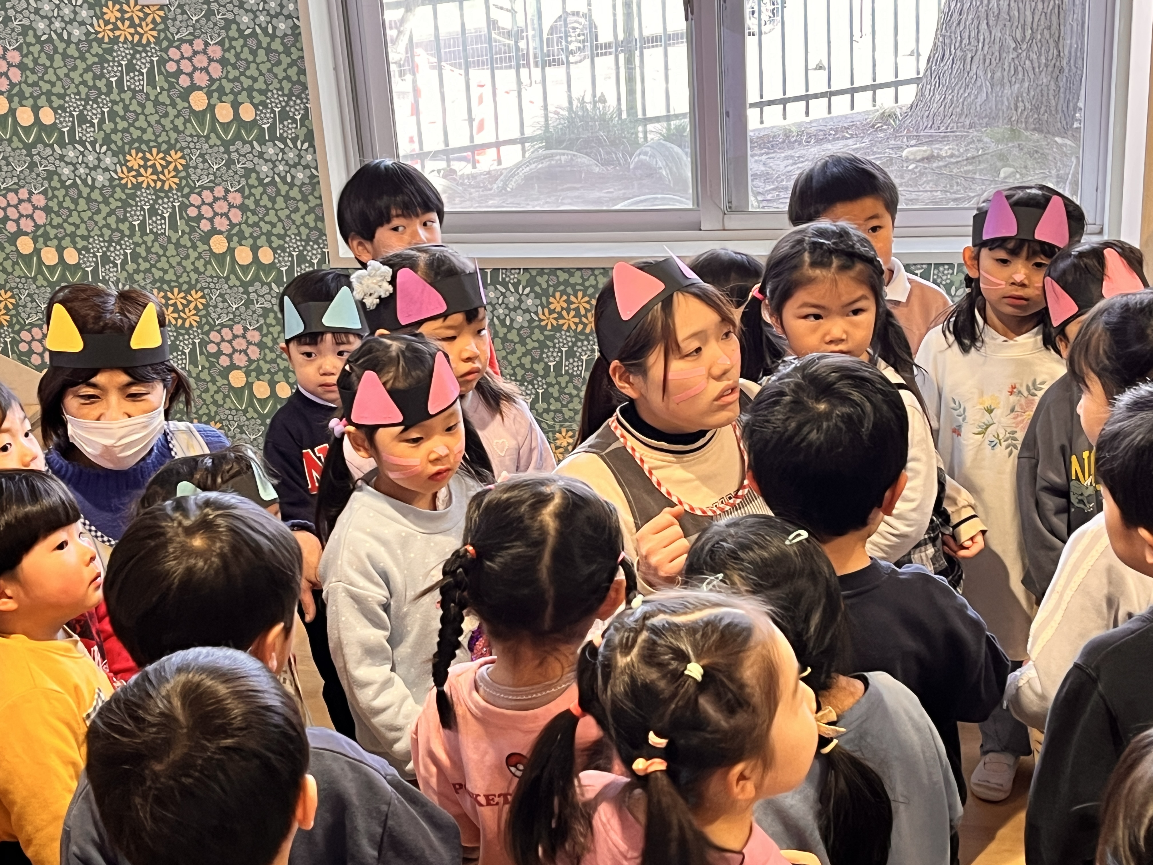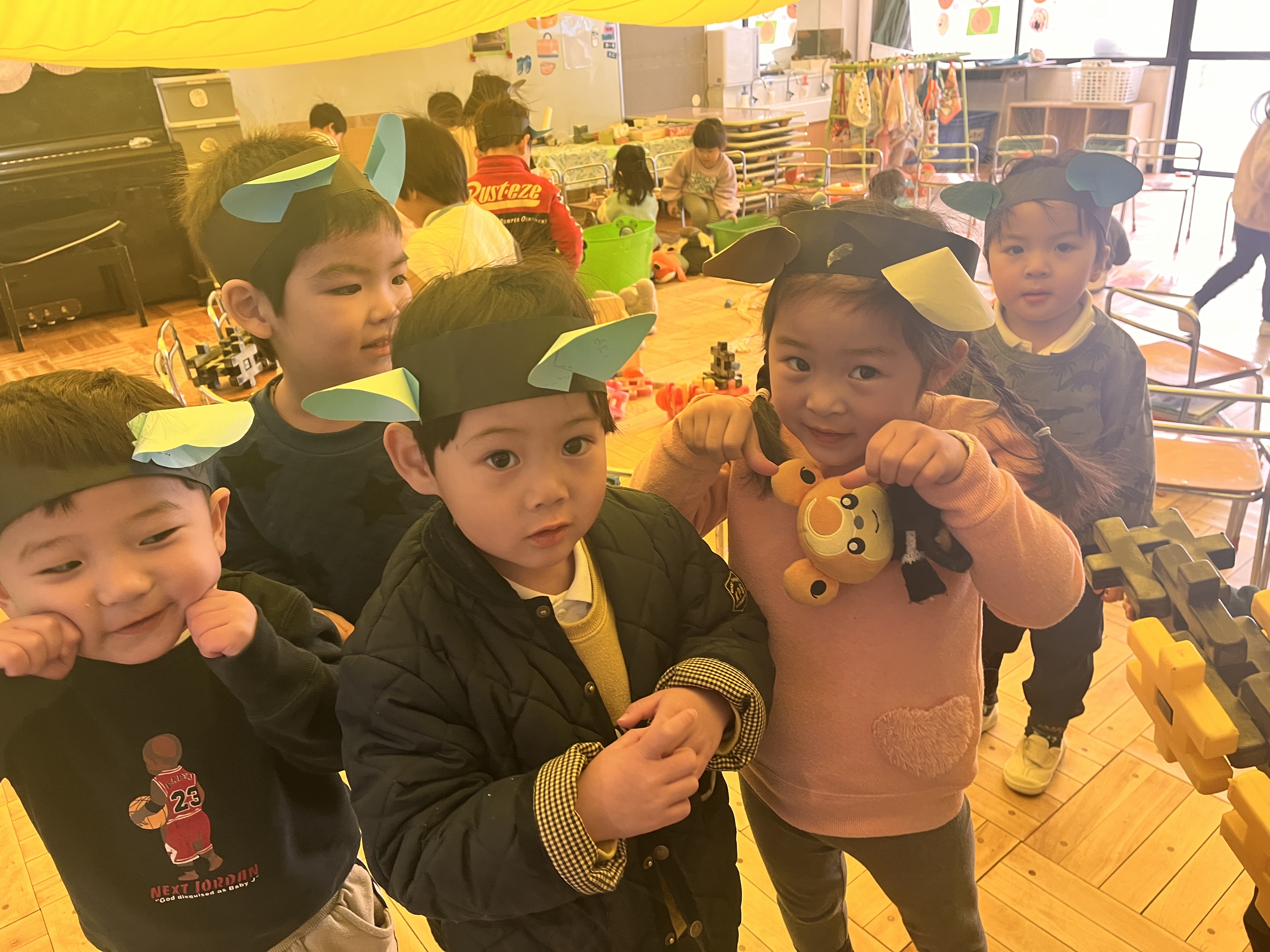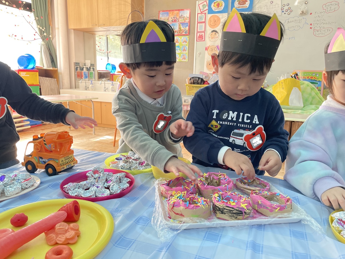 年少さんは3クラスが動物になりきって楽しい場面を繰り返し遊ぶことをとても喜んでいます!「チューチュー!」「にゃあ にゃあ🐱」と鳴き声で話をしたり、ごはんやおやつを作ったりしています。