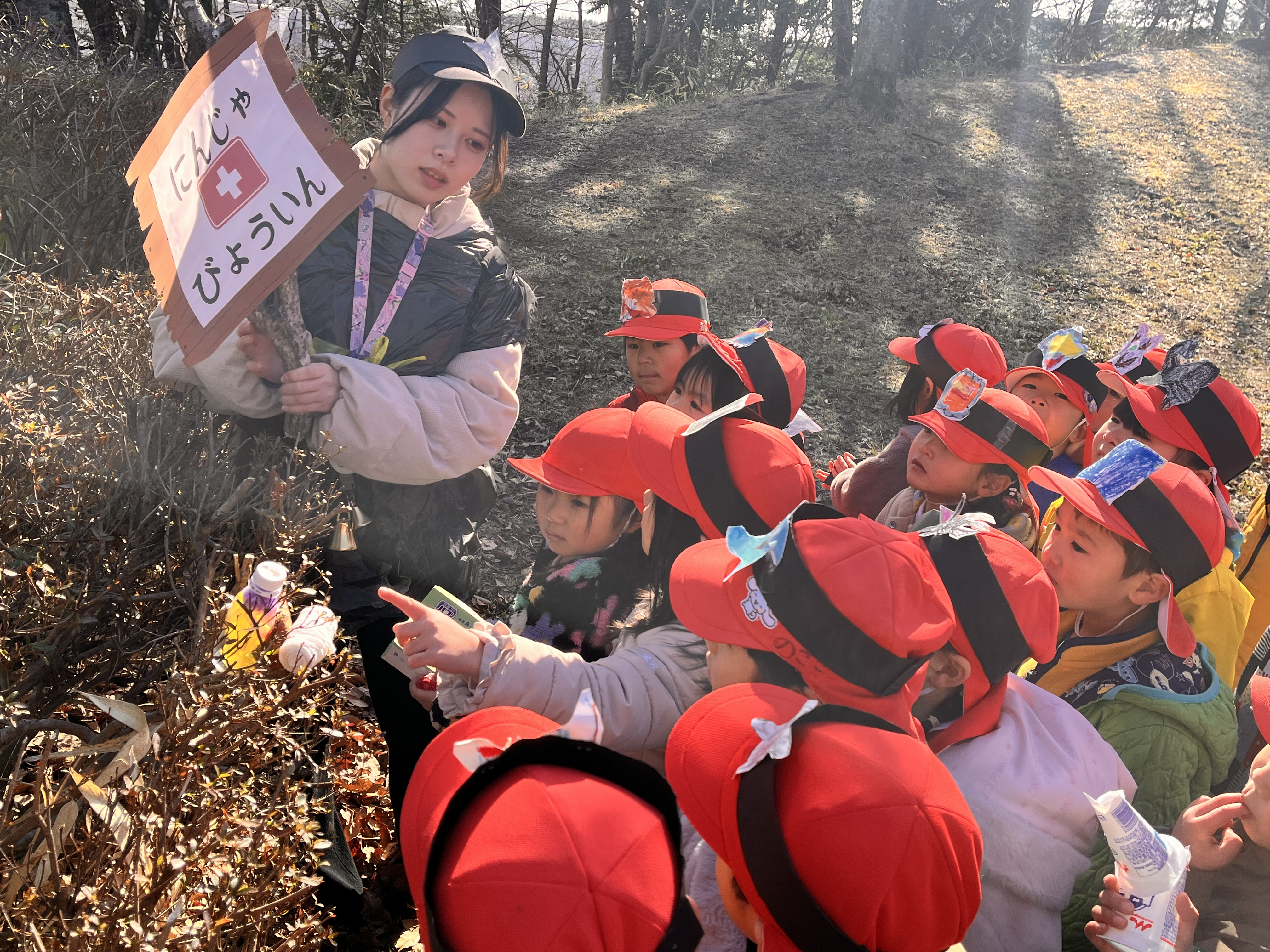 年中組では、身体表現でなりきりながら、時には教師が悪者になってアクセントを加えたり、また時には子ども達と同じ目線の役になり、何でも屋のような存在で子ども達から出てくるアイディアの伝達役になったりしています。子ども達はというと、それぞれの役になりきり、室内、野外問わず遊んでいます!